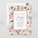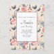 Una postal de invitación de fiesta con un elegante patrón. rosas rosas rosas, mariposas grises azules y una torre Eiffel. Un patrón de temática francesa.
