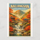 Travel poster featuring Naejangsan Mountain, South Korea, in a classic retro travel-poster style. Central focus on vibrant autumn maple forests surrounding ancient temples and stone bridges, with gentle waterfalls flowing through misty valleys. Warm golden sunlight filters through red and orange leaves, creating a poetic, seasonal atmosphere. Rich color palette of maple red, amber gold, forest green, and soft sky blue. Clean graphic illustration with subtle vintage grain texture. Bold vintage typography headline: “NAEJANGSAN – AUTUMN PARADISE OF KOREA”. Vertical 2:3 layout, high-resolution, print-ready.