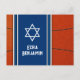 Tarjeta de agradecimiento para Bar Mitzvah con tema de baloncesto con fondo de baloncesto y acentos azules. Esta tarjeta de agradecimiento para Bar Mitzvah con tema de baloncesto es elegante y moderna. Esta tarjeta de agradecimiento para Bar Mitzvah con tema de baloncesto presenta un fondo de textura de baloncesto naranja con un fondo que imita una camiseta azul para el nombre y la estrella de David. Los colores en este diseño de Bar Mitzvah con tema de baloncesto son naranja, azul, blanco y negro. El nombre de su hijo está en una fuente en negrita.