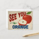 Una encantadora postal de viaje vintage de California, Naranja, con una hermosa manzana roja, junto con un divertido texto de estilo retro que dice, "Nos vemos en Naranja"