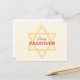 Esta postal presenta un enfoque minimalista y moderno a los saludos de la Pascua. Dominando el diseño se encuentra una gran Estrella de David dorada, con líneas nítidas y audaces, que crean una interacción de simetría geométrica y espacio. Superpuesto a la estrella está la frase "Happy PASSOVER" en un contrastante tipo de letra rojo y dorado, que añade un toque de calidez y celebración a la tarjeta. El fondo es un sutil tono crema, asegurando que la estrella y el mensaje festivo sean los puntos centrales del diseño. Esta elección de color de fondo realza los tonos dorados de la Estrella de David y le da a la tarjeta un aspecto suave y acogedor. La sencillez del diseño transmite una elegancia contemporánea, lo que lo hace apto para una amplia audiencia que desea enviar sus deseos de Pascua con un toque de sofisticación moderna.