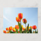 Postal de flores de tulipanes naranjas y rojos vistos desde un punto de vista bajo contra un cielo azul.