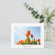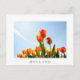 Postal con flores de tulipanes naranjas y rojos vistos desde un punto de vista bajo contra un cielo azul con un borde blanco y el texto 'Holanda'.