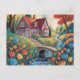 Una vibrante escena de arte naif con una gran casa enclavada en colinas onduladas, vivos azules, naranjas y amarillos floreciendo en el fondo, altos árboles rodeando un elegante puente de piedra sobre un suave arroyo, todo bajo un agitado cielo de mosaico lleno de movimiento y color.