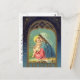 bello cuadro vintage de madonna y niño dentro de una arcada dorada con estrellas doradas en un cielo azul. mary sostiene a la bebé jesús en los brazos y lleva vestido rojo, manto azul, toalla azul y blanca y un anillo dorado sobre su cabeza. natividad decorativa con madonna y niño mirándose el uno al otro, paisaje al fondo y mesa con heno en primer plano. pintura de navidad vintage en rojos y azules.