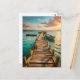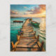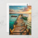 Step into a moment of tranquility with this beautiful coastal postcard. A weathered wooden pier stretches out over calm turquoise water, leading toward gently bobbing boats and a golden sunset sky. The painterly detail and warm, reflective light create a serene, wanderlust-filled scene. Perfect for sending vacation greetings, thoughtful notes, or sharing a peaceful seaside feeling with someone special.