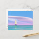 Postal con mi arte digital de un velero en aguas turquesas tranquilas con nubes onduladas, cielo azul y horizonte rosado.