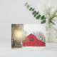 Hermoso granero de Navidades rojos con luz solar suave a través de árboles de granja