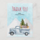 Gracias postal con un diseño festivo de Navidades. Camión acuático con Navidades de pinos y animales de bosque. Un oso, un zorro y un ciervo parados en la parte de atrás yendo a dar un paseo.