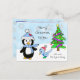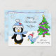 Cute Whimsical Navidades Pingüino y Ave comiendo semillas de pájaro con árbol de Navidad y copos de nieve en la tarjeta de Navidades postales personalizada de fondo,