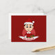 Postal con el ilustracion de un lindo sonriente chico caucásico con el pelo negro corto, el niño está usando un disfraz de Papá Noel con un gorra rojo y sosteniendo un regalo; en un círculo rojo sobre un fondo rojo, un Navidad de vacaciones diseño con una plantilla de texto editable para tu nombre o mensaje
