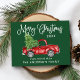 Moderna caligrafía divertida Script Watercolor Vintage Camión Rojo con árbol de Navidad - Feliz postal de Navidad - Fondo Verde Forestal