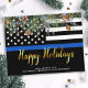 Envía saludos navideños de Feliz a amigos, familia, compañeros de los departamentos de aplicación de la ley y a tu comunidad con esta tarjeta de Navidad especial de la policía de la Línea Azul delgada - Bandera estadounidense con los colores de la bandera de la policía, negro y azul moderno con hojas y bayas huecas y un elegante guión de oro. Personalice su mensaje y su apellido o departamento de policía . Estas tarjetas de Navidades de policía son perfectas para las familias de la policía y de las fuerzas del orden, así como para los departamentos de policía. DERECHOS RESERVADOS © 2020 Judy Burrows, Black Dog Art - Todos los derechos reservados. Navidades del Departamento de Policía de Presupuesto Postales Felices Fiestas