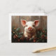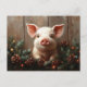 Postal con pintura al óleo digital de un lindo cerdo rodeado de conos de pino y guirnaldas de pinos con luces de Navidad. El fondo de madera aporta un toque rústico a las obras de arte.