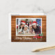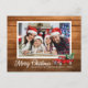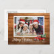 Un bello guión caligráfico de estilo rústico de madera "Feliz Navidad", tu foto familiar, nombre con año u otro texto y un camión rojo vintage con árboles de Navidad. Personalice su mensaje en la parte posterior de la tarjeta para que tenga el toque perfecto.