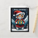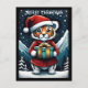 Un tigre lindo con un Sombrero Santa y sosteniendo un regalo de Navidades en la nevada postal de fondo.