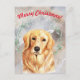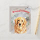 Esta tarjeta de Navidades con la escena nevada de acuarela y el recuperador dorado se siente como si fuera la portada de un cuento de hadas, con una historia mágica y un final feliz unido a ella.