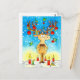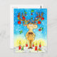 ¡Envíen esta linda tarjeta de reno a amigos y familiares para desearles unas vacaciones felices para Navidades! El cielo es azul oscuro y el suelo está cubierto de nieve. La escena está iluminada por algunas velas rojas paradas en la nieve. Los ratones y los pequeños pájaros verdes se han reunido para decorar las gargantas de un ciervo o reno para los Navidades. El reno está parado en sus patas traseras, sonriendo y mirando hacia sus cuernos. Hay ratoncitos grises sentados en las ramificaciones, colocando adornos de navidad y oropel rojos, traídos a ellos por pequeños pájaros verdes. Otros ratones y pájaros están parados en la nieve a los pies de los renos mirando su trabajo con admiración y asombro.