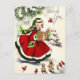 Vintage, de los años 40 o 50, tarjeta de Navidades de la era con una adorable niñita con sus mejores Navidades vestidos y bufanda. Un conejito, ardilla y pájaros rojos escuchan a sus Navidades cantantes Carols.