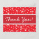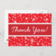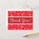 Envíe un agradecimiento con esta postal cubierta de copos de nieve blancos sobre un fondo rojo. La tarjeta tiene una tira roja a través del centro con el texto "¡Gracias!" en letras blancas.