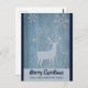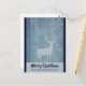 Postal de vacaciones con fondo de imitación de color azul. Encendido sobre la parte superior hay una silueta de un reno con grandes cuernos y algunos copos de nieve y estrellas que caen a su alrededor.