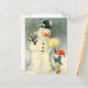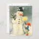 Uno de los elfos de Santa sostiene una vela encendida para que un muñeco de nieve vea en esta encantadora imagen de arte de la era victoriana. ¡Celebremos las Fiestas a la antigua!