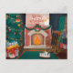 Postal navideña vintage con chimenea. Hermosa postal vintage de la escena navideña. Este diseño cuenta con una hermosa chimenea y está decorado con guirnaldas y velas. Hay un gato dormido en la alfombra y un montón de regalos sentados debajo del luminoso árbol de Navidad decorado. Qué hermosa escena de las vacaciones.