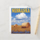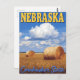A retro-style travel art postcard celebrating Nebraska, the 'Cornhusker State.' The illustration captures a classic scene of the Great Plains with large, golden hay bales resting in a harvested field under a wide, dramatic blue sky filled with puffy white clouds. Perfect for evoking the feeling of the American heartland and its agricultural heritage.