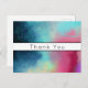 Tarjeta postal de agradecimiento con un diseño abstracto fresco y elegante. Las acuarelas se mezclan y crean la ilusión de una imagen espacial. Verde con remolinos de púrpura, amarillo y rojo claro se mezclan junto con una lluvia de puntos blancos y estrellas. Una creación artística elegante.