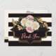 Esta tarjeta postal de agradecimiento para la despedida de soltera combina con la colección de invitaciones para la despedida de soltera que se muestra a continuación y presenta un patrón de rayas horizontales anchas en negro y marfil con un cuadro de texto decorativo en forma de corchete negro con dos bordes dorados exteriores. Hay un gran ramo floral colorido en la parte superior central de la tarjeta postal y tiene hermosas rosas en crema, marfil y rosa, con lirios peruanos naranjas y follaje verde. La parte posterior de la tarjeta postal es de color marfil y tiene un pequeño borde inferior en negro con una franja de oro simulado en todo el ancho de la tarjeta. Otro pequeño ramo floral está en la esquina inferior derecha. La tarjeta postal se deja en blanco para que escribas a mano un mensaje de agradecimiento, pero también puedes agregar un mensaje de agradecimiento impreso previamente u otro texto si lo prefieres. Es una forma perfecta de terminar