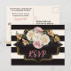 Esta tarjeta postal de respuesta de la fiesta de despedida de soltera es una opción asequible para su evento y coincide con la colección de invitaciones de la fiesta de despedida de soltera que se muestra a continuación. Cuenta con un patrón de rayas horizontales anchas en negro y marfil con una caja de texto decorativa en forma de corchete negro con dos bordes dorados exteriores. Hay un gran ramo floral colorido en el centro superior del frente de la tarjeta postal que tiene hermosas rosas en crema, marfil y rosa, con lirios peruanos naranjas y follaje verde. La parte posterior de la tarjeta postal es de marfil y tiene un pequeño borde inferior en negro con una franja de oro simulado a lo ancho de la tarjeta. Otro pequeño ramo floral está en la esquina inferior derecha. La parte posterior de la tarjeta postal de respuesta está compuesta con la redacción estándar de respuesta en negro y rosa coral. Si prefiere una tarjeta de respuesta con sobre en su lugar,