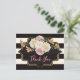 Esta tarjeta postal de agradecimiento para la despedida de soltera coincide con la colección de invitaciones para la despedida de soltera que se muestra a continuación y presenta un patrón de rayas horizontales anchas en negro y marfil con un cuadro de texto decorativo en forma de corchete negro con dos bordes dorados exteriores. Hay un gran ramo floral colorido en la parte superior central de la tarjeta postal y tiene hermosas rosas en crema, marfil y rosa, con lirios peruanos naranjas y follaje verde. La parte posterior de la tarjeta postal es marfil y tiene un pequeño borde inferior en negro con una franja de oro simulado en todo el ancho de la tarjeta. Otro pequeño ramo floral está en la esquina inferior derecha. La tarjeta postal se deja en blanco para que escriba a mano un mensaje de agradecimiento, pero también puede agregar un mensaje de agradecimiento impreso previamente u otro texto si lo prefiere. Es una forma perfecta de terminar su