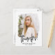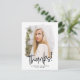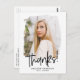 Moderna, moderna y de moda, gracias a la postal que presenta la foto del graduado dentro de un marco de máscara texturizada con "¡Gracias!" en un guión escrito a mano en negro. Personalice la parte delantera de la graduación gracias postal añadiendo el nombre del graduado y el año de graduación. La tarjeta postal se invierte para mostrar la dirección de retorno y el mensaje de personalizado.