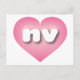 Esta postal tiene un corazón rosado con un centro lavado de blanco que contiene las letras negrita, blanca, funda inferior nv, una abreviatura juguetona para Nevada, el estado plateado. El reverso de la postal está en blanco, esperando el texto personalizado o los sentimientos manuscritos.