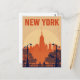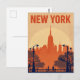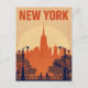 Capture the iconic grandeur of New York City with this striking retro travel postcard. The design features the majestic silhouette of the Empire State Building towering over the urban skyline, with figures strolling through a foreground park. The warm orange and blue palette gives this artwork a powerful, vintage appeal, perfect for celebrating Manhattan and the classic US cityscape.