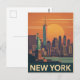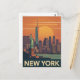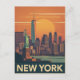 Esta elegante tarjeta ofrece un ilustracion de estilo vintage con el icónico paisaje de Nueva York. El diseño capta la majestuosa Estatua de la Libertad y el moderno paisaje urbano, incluyendo la torre de la Libertad, todo bañado en el cálido y naranja resplandor de un sol abrasador. La paleta de colores clásica y la tipografía retro "NUEVA YORK" le dan un aire atemporal de afiches de viaje. Perfecto para un saludo nostálgico o una nota para cualquiera que ame la Gran Manzana.
