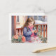 Imagen detallada de una linda niña haciendo manualidades al aire libre en un día nevado. Colores pastel suaves. La escritura en la parte posterior desea a los destinatarios un "¡Feliz cumpleaños!"