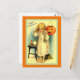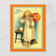 Esta niña dulce está admirando su linterna Jack-O-Lantern mientras peina su pelo en preparación para la Noche de Halloween en esta copia mejorada y ligeramente alterada de una imagen vintage.