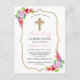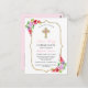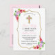 Invite a amigos y seres queridos a asistir a la primera comunión de su hija con esta hermosa tarjeta postal de invitación a la comunión con flores rosadas y cruz dorada. Esta invitación para la primera comunión de esta niña presenta un simple fondo blanco con una hermosa cruz dorada que tiene un ramo floral rosa. La parte trasera de esta invitación rosa a la comunión tiene un suave fondo rosa con lunares muy claros. Personalice esta invitación de primera comunión para niñas con el nombre de su hijo e información del lugar.