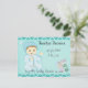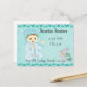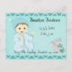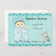 Un lindo bebé de bebé con un bebé sentado vestido de azul sobre un fondo azul pastel con un grupo de rosas. En la parte superior de la letra decorativa grande está el nombre del niño, y debajo y en la parte inferior también en letras decorativas está la fecha y hora de nacimiento del niño. En el centro están las estadísticas de nacimiento, la longitud y el peso. Un recuerdo perfecto para el chico del recién nacido. Todo esto sobre un fondo verde azulado (verde azul) de patrón de quatrefoil.