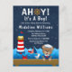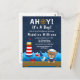Esta encantadora y divertida invitación incluye a un marinero oso en una cubierta de madera con gaviota y cangrejo. Al fondo, un faro rojo y blanco, un bonito pájaro en un velero, olas del océano y un cielo estrellado azul marino. El texto combina fuentes audaces y serif para un estilo elegante y moderno. Es ideal para una ducha de natación con temática náutica.