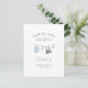 Nuestra hermosa tarjeta postal de agradecimiento presenta una encantadora ilustración de acuarela de diminutas ropas de bebé niño colgadas de una cuerda de tender. Cada pieza está pintada con cariño con colores pastel suaves, creando un diseño conmovedor y elegante que establece perfectamente el tono para celebrar la llegada de un precioso niño.