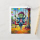 Esta vibrante ilustración de Halloween presenta a un niño zombie verde con ojos abiertos columpiándose bajo banderas de fiesta coloridas y hojas de otoño. Con texturas pictóricas y una sonrisa juguetona, este personaje creepy-cute añade diversión espeluznante a cualquier correo o colección de arte miniatura.