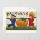 Huella vintage de un niño y chica llevando una calabaza, para hacer una linterna para Halloween noche.