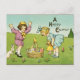 Esta postal ofrece un ilustracion del vintage de dos niños, una cesta de huevos y un conejito.