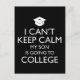 No puedo mantener la calma - Mi hijo va a la universidad. El cómico cómplice es un gran regalo para la madre o el padre de un estudiante universitario. ¡Perfecto para los padres sin hogar que tienen un hijo que va a la universidad por primera vez! Este genial humor de la universidad dice que el diseño es genial para los padres de un estudiante que va a la educación superior por primera vez, un estudiante de primer año o un estudiante que vuelve a la escuela. Incluye un gráfico de un gorro de graduación.