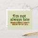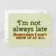 Esto dice: "No siempre llego tarde. A veces no aparezco en absoluto". Para los serios disidentes y los que duermen mucho.