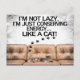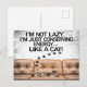 Un gato perezoso descansando cómodamente sobre una superficie suave, su cuerpo se estira con patas colgando y los ojos medio cerrados en puro descanso. El gato parece estar completamente a gusto, disfrutando de la calidez de la habitación, con una expresión de calma y contenido en la cara. ¡Es la imagen perfecta de pereza y felicidad!