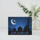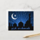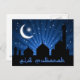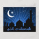 Ilustracion Eid Greeting con siluetas de la luna, estrellas y una mezquita en un cielo azul nocturno.