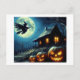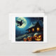 Una bruja vuela sobre un palo de escoba a través de una luminosa luna llena, proyectando un resplandor espeluznante sobre una casa espeluznante y tres calabazas talladas. El conjunto se completa con murciélagos que vuelan al fondo y árboles descalzos colocados sobre el cielo nocturno.